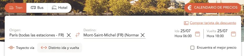 Si deseas comprar tu ticket, simplemente debes buscar el tren desde Paris hasta el Mont Saint-Michel en el sitio oficial de los trenes en Francia: oui.sncf Es importante que lo escribas como en la siguiente imagen para que te aparezca en los resultados.