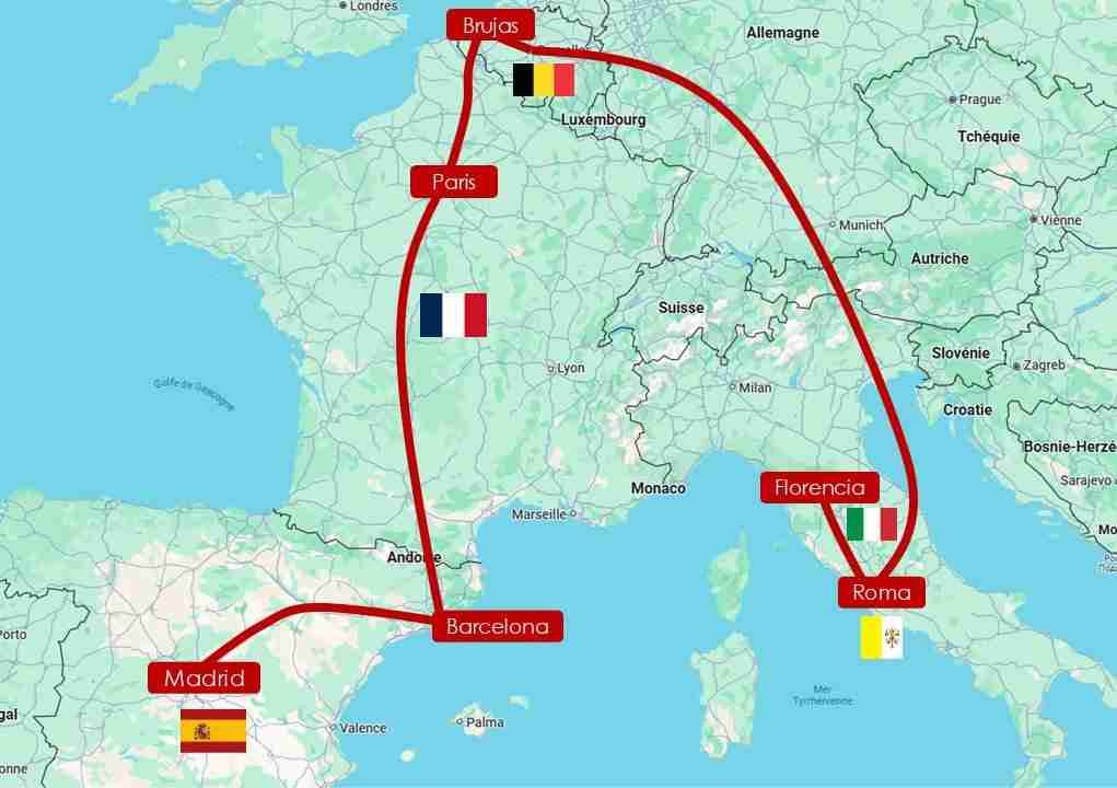 Madrid, Barcelona, Paris, Brujas, Roma, Florencia, Vaticano